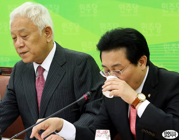 전병헌 민주당 원내대표가 22일 서울 영등포구 중앙당사 회의실에서 열린 최고위원회의에서 목이 타는 듯 물을 마시고 있다.