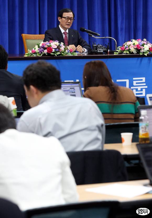 이순우 우리금융그룹 회장 내정자가 23일 오후 서울 종로구 우리카드 본사 대강당에서 열린 기자회견에서 취재진의 질문에 답하고 있다.