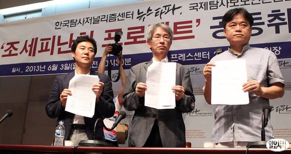인터넷 언론 뉴스타파가 3일 오전 서울 중구 프레스센터에서 기자회견을 열고 국제탐사보도언론인협회(ICIJ)와 공동으로 취재한 한국인 조세피난처 4차 명단을 공개하고 있다. 이날 기자회견에서 전두환 전 대통령 장남인 전재국씨가 페이퍼컴퍼니를 설립했다고 발표했다. 사진 왼쪽부터 이근행 뉴스타파 EP, 김용진 뉴스타파 대표, 최승호 뉴스타파 PD.