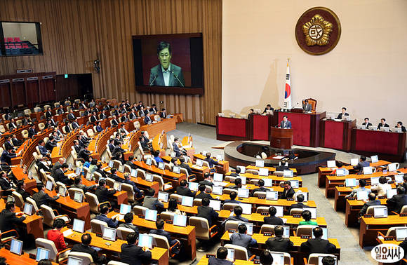 최경환 새누리당 원내대표가 4일 오전, 서울 여의도 국회 본회의장에서 교섭단체 대표연설을 하고 있다.
