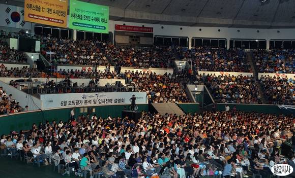 6일 오후 서울 잠실학생체육관에서 이투스청솔 교육평가연구소 주최로 열린 '6월 모의평가 분석 및 입시전략 설명회'에서 학생들과 학부모들이 강사의 설명을 경청하고 있다.