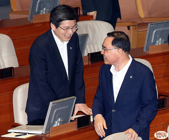 정홍원 국무총리(사진 오른쪽)와 황교안 법무부장관이 10일 서울 여의도 국회 본회의장에서 열린 정치분야 대정부질의 자리에서 웃으면서 대화를 나누고 있다.