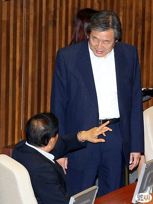 '친이계의 좌장' 이재오 의원(사진 좌)과 '친박계 좌장' 김무성 의원이 11일 오전, 국회 본회의장 대정부질문에 앞서 대화를 나누고 있다.
