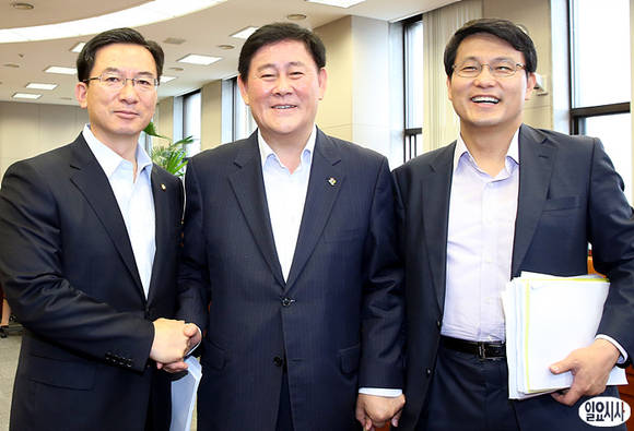 최경환 국회 운영위원장(사진 가운데)과 정성호 민주당 간사(사진 왼쪽), 윤상현 새누리당 간사가 12일 오후 국회 운영위원회 전체회의에서 동북아역사왜곡대책 특위와 남북관계발전 특위 구성을 의결 후 카메라 앞에 서 있다.