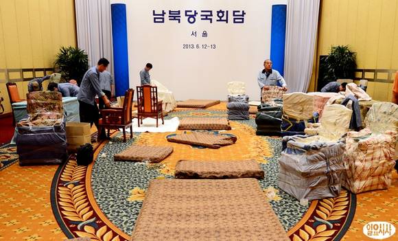 남북 당국이 회담에 참석할 수석대표의 격 차이로 대립하다 회담 자체가 보류된 가운데 12일 서울 홍은동 그랜드힐튼호텔에 마련된 회담장에서 관계자들이 시설물을 철거하고 있다.