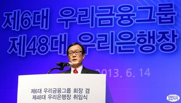 이순우 우리금융지주 신임 회장이 14일 오전 서울 회현동 우리은행 본점에서 열린 취임식에서 취임사를 하고 있다.