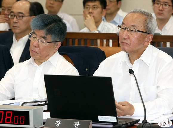 김중수 한국은행 총재(사진 왼쪽)과 현오석 부총리 겸 기획재정부 장관이 17일 열린 국회 기획재정위에서 의원들의 질의를 경청하고 있다.