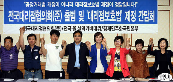 민주당 우원식 최고위원을 비롯한 국회의원들과 각계 분야 대리점협회 대표들이 17일, 서울 여의도 국회 귀빈식당에서 열린 전국대리점협의회(준) 출범 및 '대리점보호법' 제정 간담회에서 손을 맞잡은 채 대리점협의회 출범식을 갖고 있다.