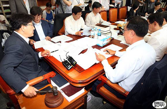 19일 오전 서울 여의도 국회에서 열린 법제사법위원회 법안심사 제1소위원회에서 권성동 소위원장(사진 왼쪽)이 의사봉을 두드리고 있다. 이날 법사위에서는 전두환 전 대통령의 미납 추징금 환수 문제와 관련한 이른바 '전두환 추징법'이 논의됐다.