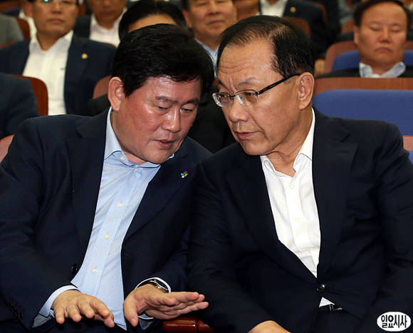 25일 서울 여의도 국회 본관 246호 회의실에서 열린 NLL 관련 새누리당 긴급 의원총회에서 황우여 대표(사진 오른쪽)와 최경환 원내대표가 대화하고 있다.