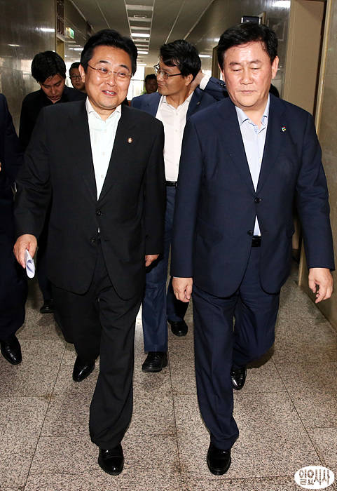 새누리당 최경환 원내대표(사진 오른쪽)와 민주당 전병헌 원내대표(사진 왼쪽)가 25일 오후, 서울 여의도 국회 본청에서 국정원 사건 국정조사와 관련해 긴급 회동을 갖고 국정원 댓글 사건과 관련해 국정조사를 실시키로 합의한 뒤 운영위원장실을 빠져나가고 있다.