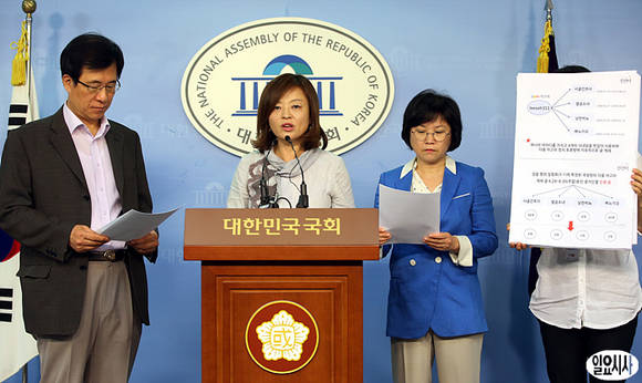 신경민(사진 왼쪽부터), 진선미, 김현 민주당 국정원선거개입진상조사특위 의원들이 1일, 국회에서 국정원 증거인멸 행위와 관련한 기자회견을 하고 있다.