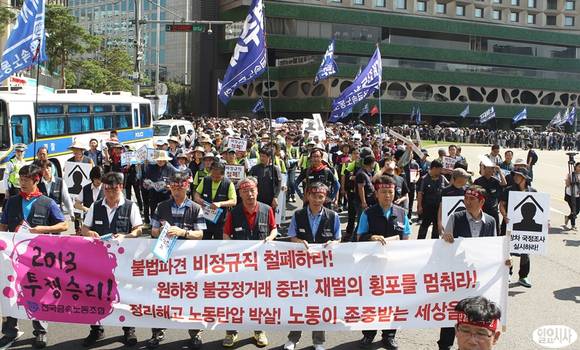 민주노총 금속노조 조합원들이 3일 오후 '2013년 투쟁승리 전국금속노동자 결의대회'를 갖기 위해 서울 중구 태평로 서울 광장 앞에서 서울역을 향해 거리행진을 벌이고 있다.