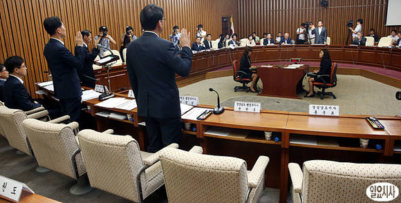 9일 국회에서 열린 공공의료 정상화를 위한 국정조사 특위 회의에서 홍준표 경남지사를 비롯한 경남도 공무원 7명이 불출석해 자리가 비어 있는 가운데 최문순 강원도지사를 비롯한 강원도 관련 증인들만 출석해 선서를 하고 있다.