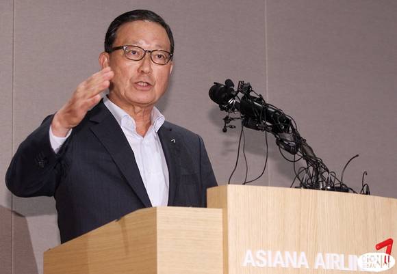 윤영두 아시아나항공 사장이 9일 오후 서울 강서구 오쇠동에 위치한 아시아나 본사 기자실에서 사고 대책 브리핑을 하고 있다. 윤 사장은 브리핑을 마친 뒤 이날 오후 여객기 충돌 사고 현장 상황을 직접 확인하고 대처방안을 마련키 위해 샌프란시스코로 출국할 예정이다.