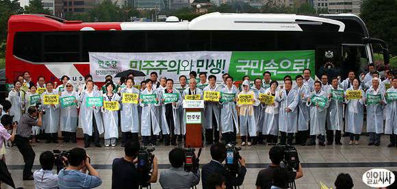김한길 민주당 대표를 비롯한 의원들이 10일 오전, 비가 내리고 있는 국회 본청 앞에서 현장 최고위원회 발대식을 열고 있다. 민주당은 오늘 부터 매주 수요일 민생현장을 찾아 현장 최고위원회의를 열기로 했다.