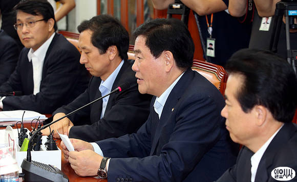 22일 오전, 새누리당 원내대표실에서 열린 금융위원회(금 거래소 설립 관련) 당정회의에서 최경환 원내대표가 모두발언을 하고 있다.