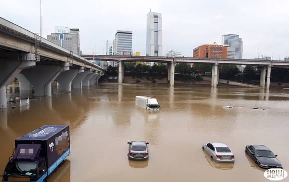 22일 서울과 경기·강원지역에 집중호우가 내린 가운데 이날 오후 서울 송파구 탄천주차장에 주차되어 있던 차량들이 물에 잠겨있다.
