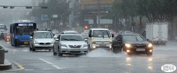 서울지방에 집중호우가 내리고 있는 23일 오후 서울 광화문 사거리에 차량들이 물살을 가르며 이동하고 있다.