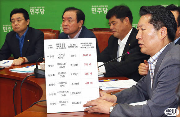 23일 오전, 국회에서 열린 민주당 원내대책회의서 남북정상회담 대화록과 관련해 정청래 의원(사진 오른쪽)이 역대 대통령 기록물 이관 횟수 자료를 들어보이고 있다.