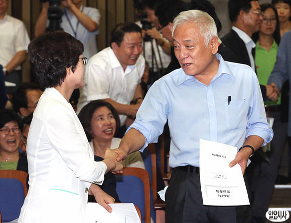 김한길 민주당 대표와 김상희 의원이 12일 오후 본회의에 앞서 열린 의원총회에서 악수를 나누고 있다.