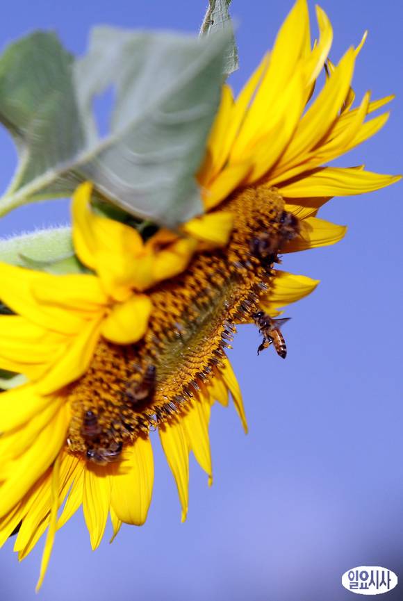 연일 폭염이 계속되는 13일 오후 서울 도봉구 창포원에 해바라기 꽃이 가을을 재촉하며 활짝 핀 가운데 꿀벌들이 꿀을 따고 있다.