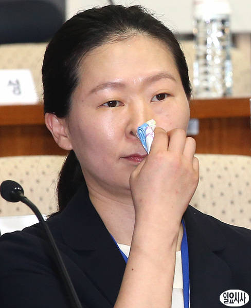 국가정보원 댓글의혹 사건 규명을 위한 국정조사 특위 2차 청문회가 19일 오전 국회에서 열린 가운데, 증인으로 출석한 권은희 전 수서경찰서 수사과장이 땀을 닦아내고 있다.