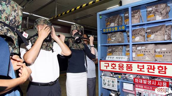'2013 을지연습' 첫날인 19일 오후 서울 지하철 2호선 홍대입구역에서 시민들이 방독면 체험을 하고 있다.