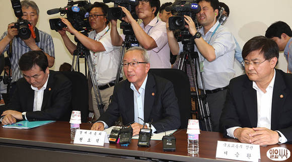 전·월세난 대책을 논의하기 위한 새누리당과 정부의 당정협의가 20일 오후 국회 새누리당 정책위의장실에서 열린 가운데 현오석 경제부총리(사진 가운데)가 답변하고 있다.
