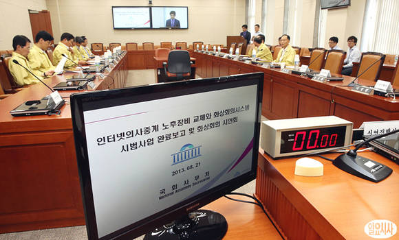 국회 기획재정위원회와 정부세종청사 간 화상회의 운용 시연회가 21일 오후 국회 기획재정위 회의실에서 열리고 있다.