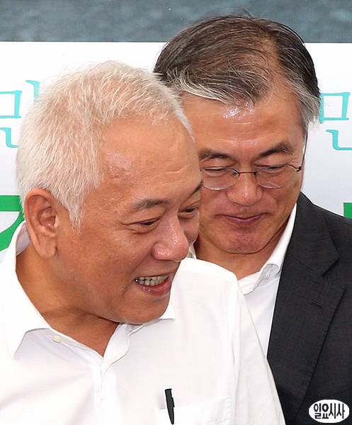 민주당 문재인 의원이 28일 오후, 서울시청 앞 민주당 천막 당사를 방문해 김한길 대표와 함께 웃고 있다. (사진공동취재단)