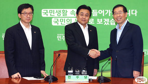 박원순 서울시장(사진 오른쪽)이 28일 오후, 서울 여의도 국회에서 전병헌 민주당 원내대표를 만나 악수를 나누고 있다.
