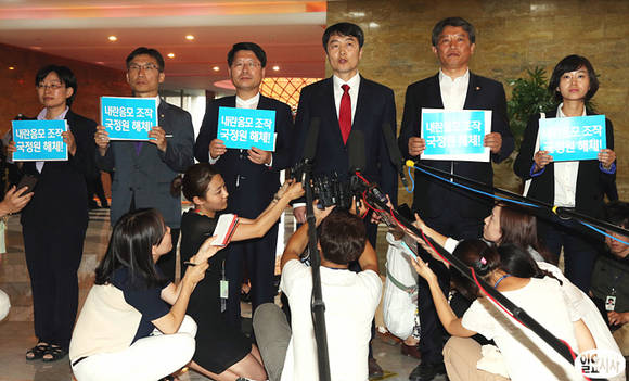 4일 오후, 국회 본회의장에서 열린 통합진보당 이석기 의원에 대한 체포동의안이 가결처리된 후 이 의원이 오병윤 원내대표와 김선동 의원과 함께 어두운 표정으로 취재진의 질문에 답변하고 있다.