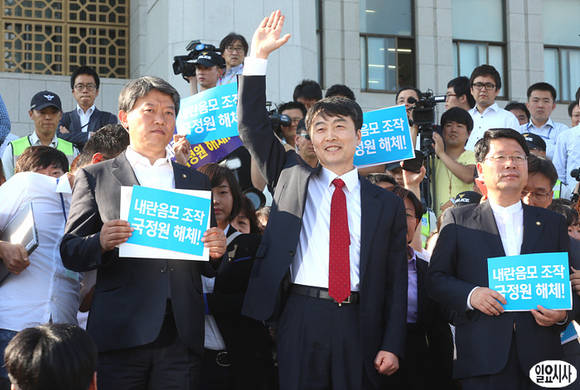 4일 오후, 국회 본회의장에서 열린 통합진보당 이석기 의원에 대한 체포동의안이 가결처리된 후 이 의원이 자신을 지지하는 지지자들에게 손 들어 답례하고 있다.