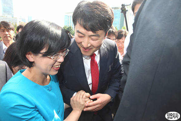 4일 오후, 국회 본회의장에서 열린 통합진보당 이석기 의원에 대한 체포동의안이 가결처리된 후 이 의원이 같은당 이정희 대표와 주먹을 꼭 쥐며 밝은 표정으로 이동하고 있다.