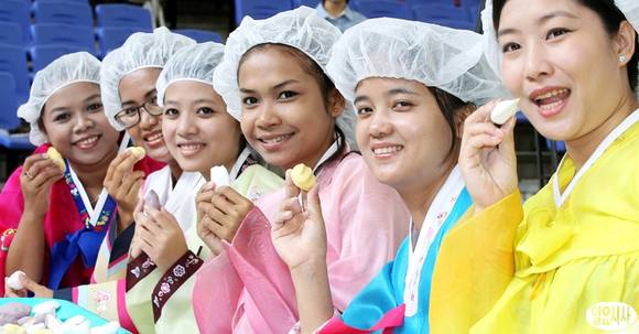 민족고유 대명절 추석을 얼마 앞둔 6일 오전 서울 송파구 서울놀이마당에서 열린 송편 빚기 행사에서 다문화 가정주부들이 한복을 입고 송편을 빚고 있다.