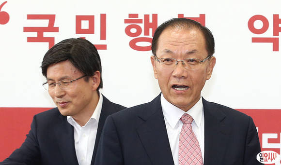 황교안 법무부장관(사진 왼쪽)이 9일 오후, 서울 여의도 국회에서 열린 법무부 당정협의회에 참석한 가운데, 새누리당 황우여 대표가 발언하고 있다.