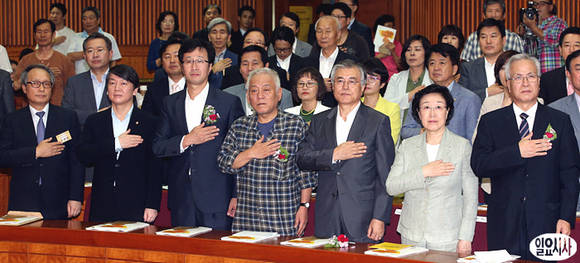 12일 오후 국회 헌정기념관에서 열린 '제4회 노무현 대통령 기념 학술 심포지엄-2013 한국민주주의 위기진단과 재민주화를 위한 모색' 세미나 직전, 이병완 노무현재단 이사장, 문재인 의원, 한명숙 전 총리, 무소속 안철수 의원 등이 국기에 대한 경례를 하고 있다.