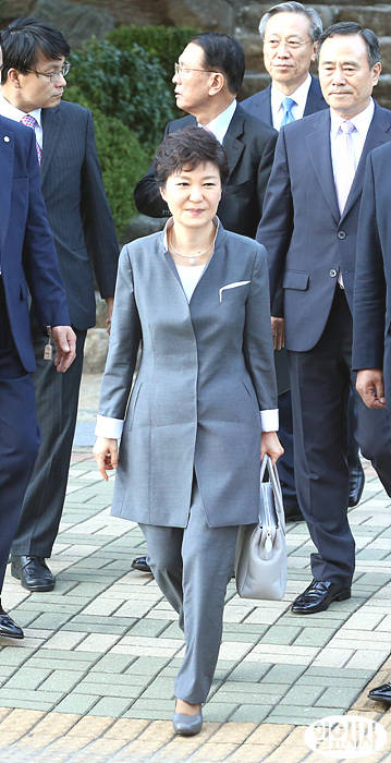 박근혜 대통령이 16일 오후 국회 사랑재에서 황우여 새누리당 대표, 김한길 민주당 대표와 3자 회담을 마친 후 이동하고 있다.