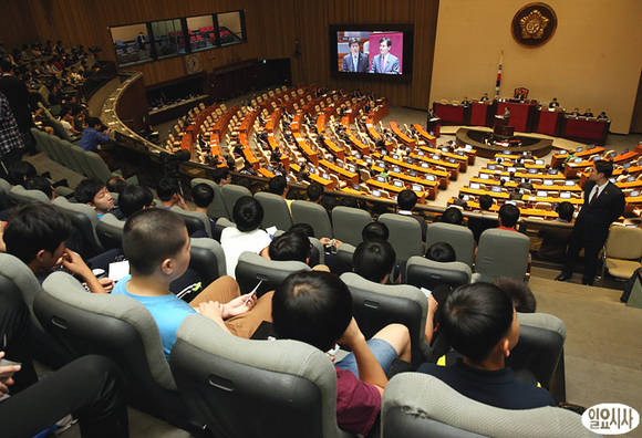 1일, 국회 본회의장에서 국회 대정부질문이 열리고 있는 가운데, 일반 관람객들이 본회의 광경을 지켜보고 있다.