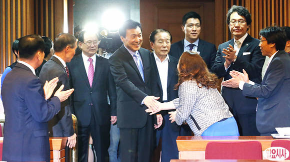 손학규 민주당 상임고문이 8일 오후, 국회헌정기념관에서 열린 동아시아미래연구 창립 심포지엄장에 입장하면서 참석자들과 악수를 나누고 있다.
