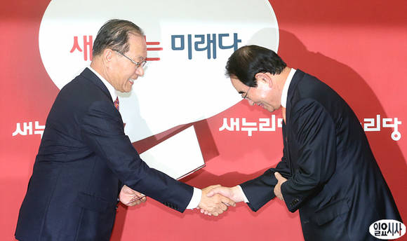황우여 새누리당 대표(왼쪽)가 8일 오후 서울 여의도동 새누리당사에서 포항남·울릉 박명재 후보에게 10·30 재·보선 공천장 수여하고 있다.