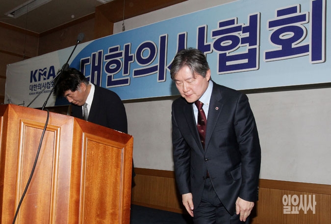 노환규 대한의사협회 회장(오른쪽)과 최재욱 의료정책연구소장이 17일 서울 용산구 이촌동 의협회관에서 기자회견을 마친 뒤 인사를 하고 있다.