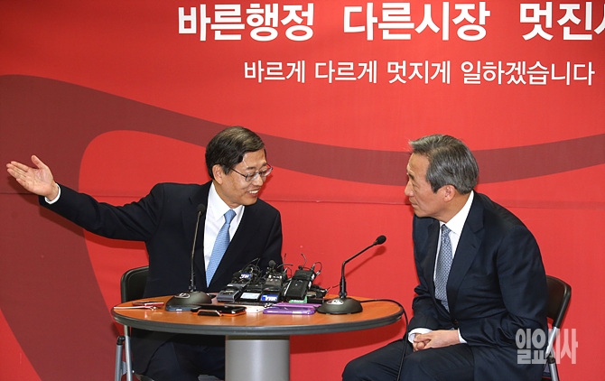 17일, 서울시장 경선 출마를 발표한 김황식 전 총리(사진 왼쪽)가 서울 여의도 본인의 사무실을 방문한 자리에서 환담을 나누고 있다.
