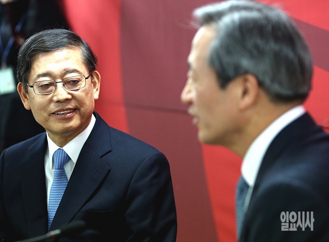 17일, 서울시장 경선 출마를 발표한 김황식 전 총리가 서울 여의도 본인의 사무실을 방문한 자리에서 이야기를 나누고 있다.