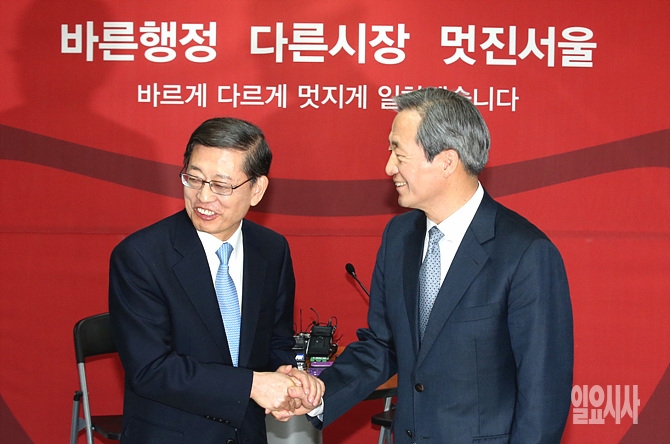 17일, 서울시장 경선 출마를 발표한 김황식 전 총리가 서울 여의도 본인의 사무실을 방문한 정몽준 새누리당 최고위원과 악수를 나누고 있다.