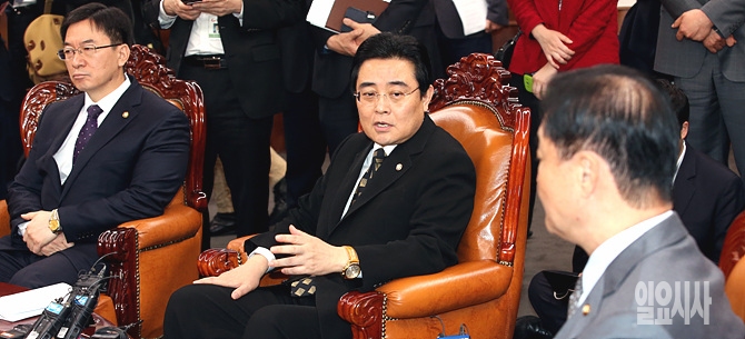 17일, 전병헌 민주당 원내대표가 국회의장실에서 열린 강창희 의장과 여야원내지도부 회동에서 원자력방호방재법 개정안 처리에 대한 당의 입장에 대해 말하고 있다.