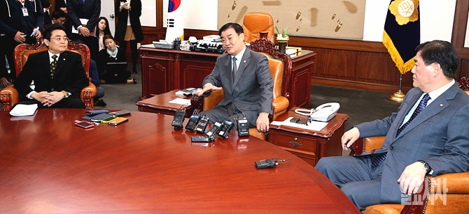 17일, 강창희 국회의장(사진 가운데)이 국회의장실에서 열린 최경환·전병헌 여야 원내지도부 회동에서 원자력방호방재법 개정안 처리와 관련해 발언하고 있다.