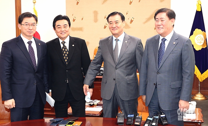 17일, 강창희 국회의장, 최경환·전병헌 여야 원내대표, 정성호 민주당 원내수석부대표가 국회의장실에서 열린 강창희 의장과 여야 원내지도부 회동 직전, 기념촬영을 하고 있다.