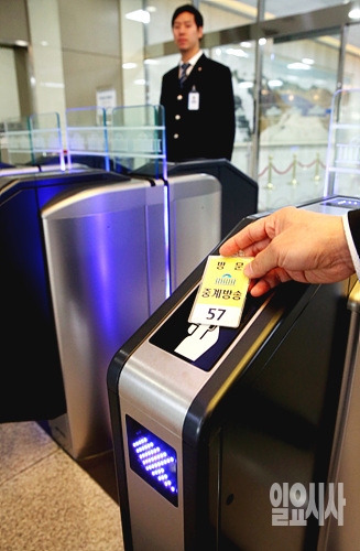 17일부터 시범운영을 시작하는 서울 여의도 국회 본관 전자출입관리시스템이 다음달 1일 정식 운영되는 가운데, 관계자가 전자시스템을 직접 시연해 보이고 있다.